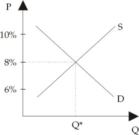 平衡利率均等借款需求量與放款供給量。如果利率太高,那麼放款人將要借出的資金,超過借款人想要借款的資金。(說服自己,在較高利率時,和其他商品一樣,放款人會想要放出更多資金,而借款人則會縮小需求。)另一方面,如果上圖中利率低於8%,則會出現可貸資金短缺,借款人會想借的(美元總額),比放款人願意提供的來得多。如供需曲線圖所示,只有8%的利率才會平衡,此時,放款人想提供的錢等於借款人希望借的錢。