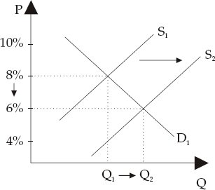 如果,社會上大部分人決定增加儲蓄,會發生什麼事?在供需的框架下,我們會把這種變化表示成可貸資金的供給曲線右移,因為,在每個假設利率(價格)下,供應者願意提供更多儲蓄到市場上借出給借款人。假設社會上漸增的儲蓄意願導致利率下降(貸款的價格)到6%,而借出與借入的美元總金額則增加。