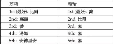 4 我們甚至不需要假設喬和比爾在莎莉跟賴瑞面前表現不同,就可以解釋友誼排名的名次差異。就算喬和比爾在莎莉跟賴瑞面前的表現都是「同一個人」,名次不同也很合理,因為偏好是主觀的。也許喬總是發出噪聲,莎莉覺得這很討厭,但賴瑞覺得這樣很熱鬧。