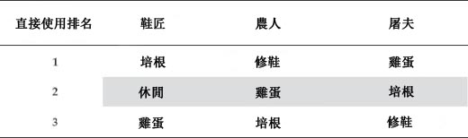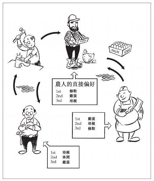 但是,請注意,這種互利的財產(與服務提供)重新安排,無法在直接交換的情形下發生。我們從故事中知道,鞋匠和農人間無法從直接交換中互利;圖表反映了這個事實,因為鞋匠認為休閒的價值高於農人提供的雞蛋。圖表還顯示出屠夫重視自己的培根甚於鞋匠的修鞋服務,所以屠夫與鞋匠間也不會有互利的直接交換。最後,農人與屠夫間同樣也沒有互利的直接交換,因為農人對培根的直接需求排名第三。如果單只有農人和屠夫涉及交換,農人也不會同意這種貿易。