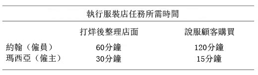 我們在上表中,看到約翰(僱員)和瑪西亞(僱主)在商場服裝店裡的假想工作表現時間表。正如數字表明,瑪西亞不管在說服銷售或在打烊後整理店面準備隔日開店,這兩個工作項目的時間表現都較佳。